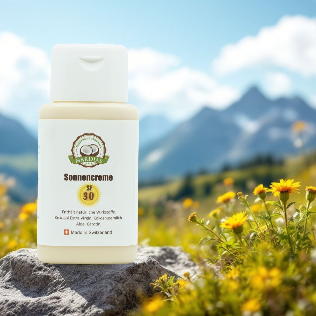 In de Schwiiz kenne mir uns mit de starkä Sunne aus, vor allem im Sommer, aber au im Winter, wenn d’Sunne vom Schnee reflektiert wird. Da isch de richtige Sonnenschutz es Muss, um dini Haut vor de UV-Strahle z’schütze. Mit de Natürli Sonnecreme vo NARDIAS COCO – handgmacht us feinstem Bio-Kokosöl – bisch du perfekt geschützt und pflegt di ächt guet.